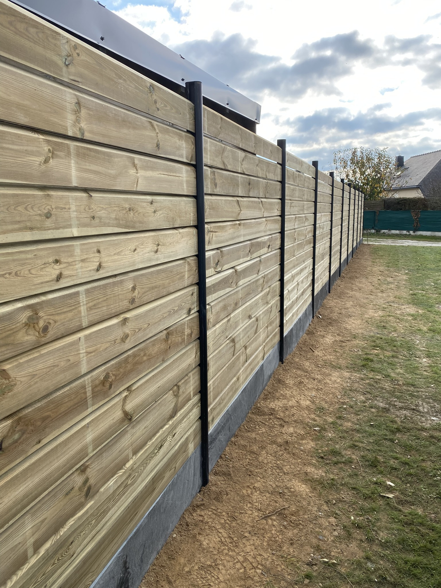 Pose d'une clôture claire voie en lames bois, poteaux alu noir et soubassement en ardoise